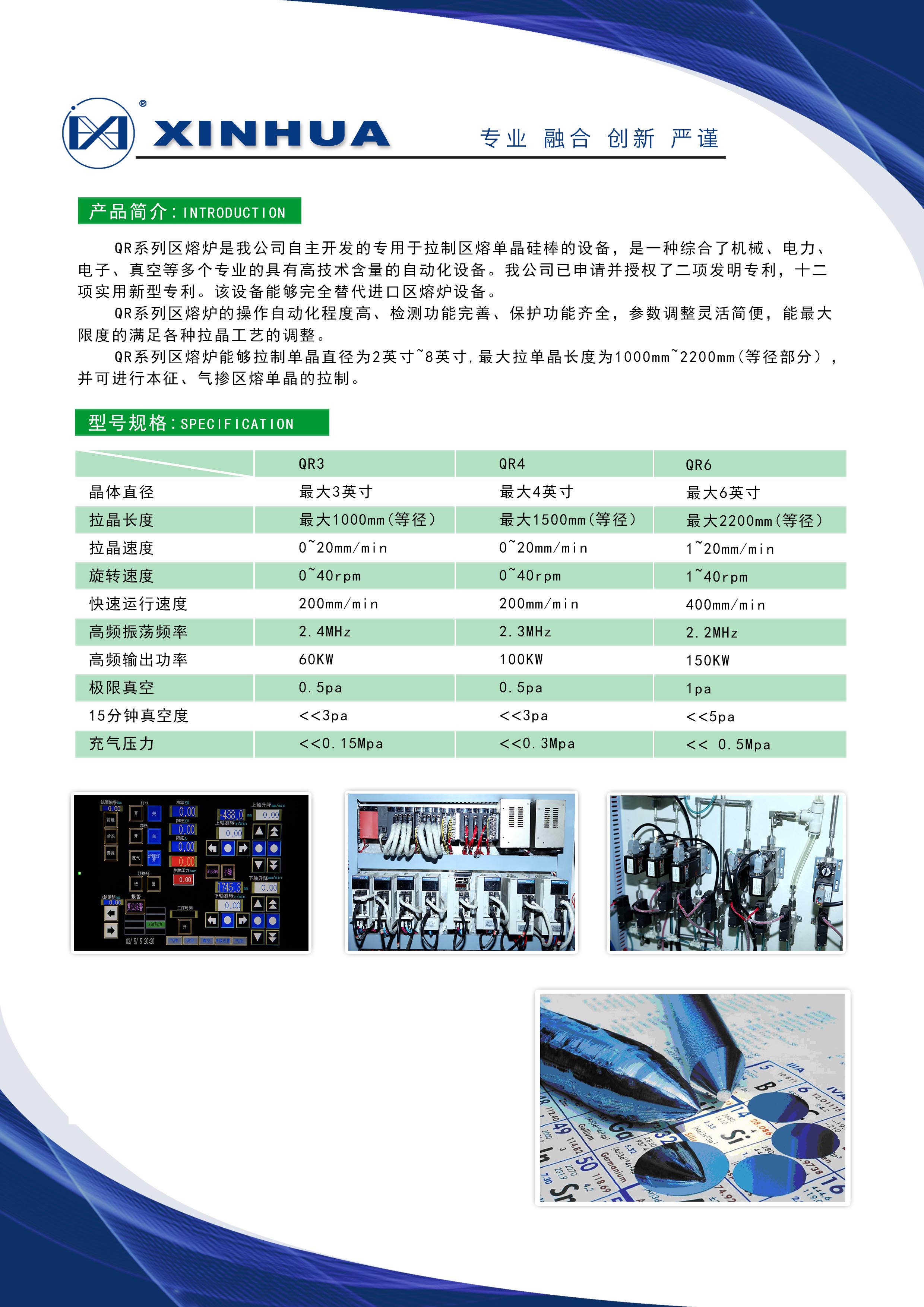 QR系列區(qū)熔爐是我公司自主開(kāi)發(fā)的專(zhuān)用于拉制區(qū)熔單晶硅棒的設(shè)備,是- -種綜合了機(jī)械、電力、電子、真空等多個(gè)專(zhuān)業(yè)的具有高技術(shù)含量的自動(dòng)化設(shè)備。我公司已申請(qǐng)并授權(quán)了二項(xiàng)發(fā)明專(zhuān)利,十二